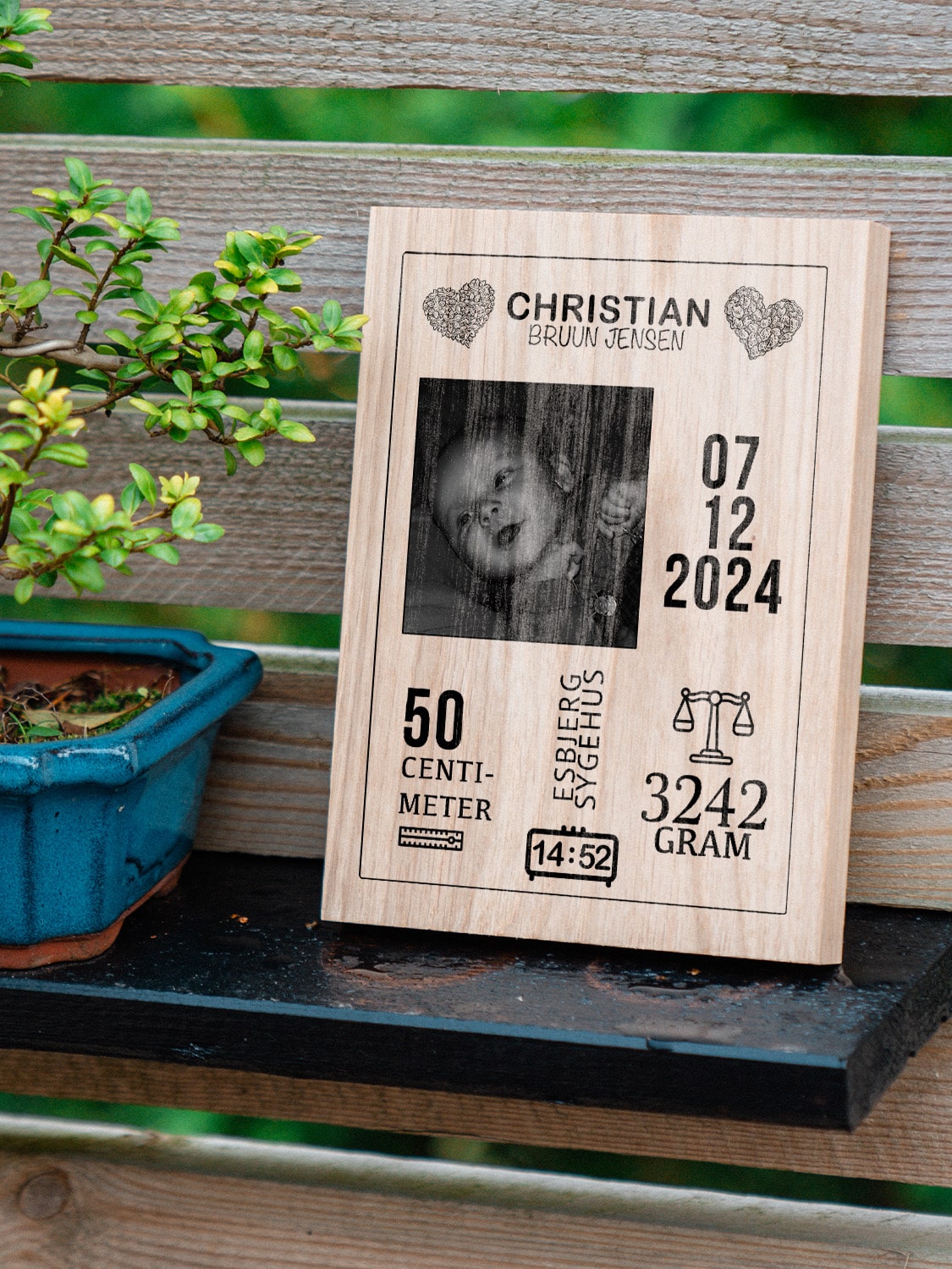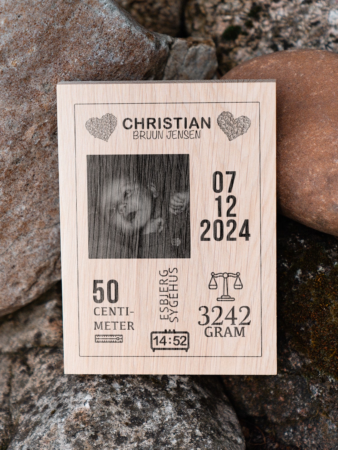 Med mulighed for at tilføje navn, fødselsdato, vægt, længde, tidspunkt, sygehus og billede bliver gaven en smuk og varig erindring om den store dag. Vores plader er lavet i høj kvalitets tysk egetræ og passer perfekt som dekoration på børneværelset eller som en hjertevarm påmindelse om et særligt øjeblik.